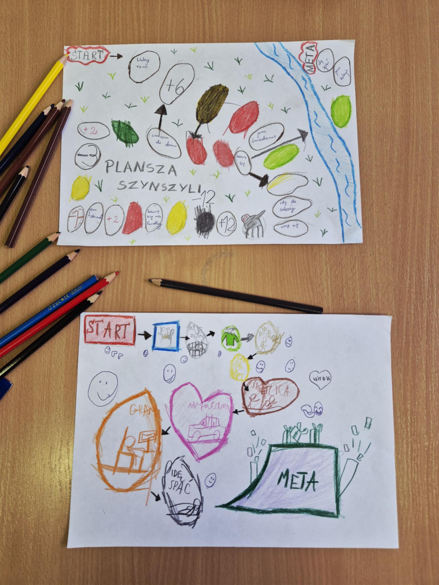 Pani Kinga Blachowska w klasie 1A oraz na zajęciach indywidualnych poprowadziła warsztaty, w czasie którego swtorzyli własne gry planszowe, gdzie każde pole to element ich planu dnia. Dzieci wymyśliły, co dzieje się na poszczególnych polach. Co jest startem? Co jest metą? Czy brakuje im miejsc, gdzie mogą się zatrzymać i zyskać siłę, aby przeskoczyć potem kilka pól do przodu szybciej?