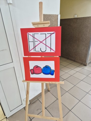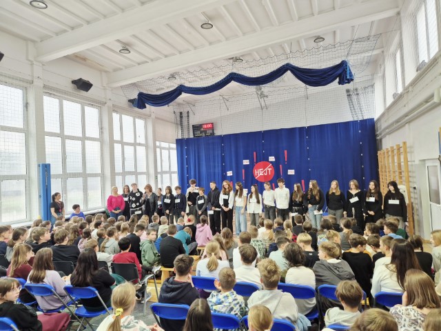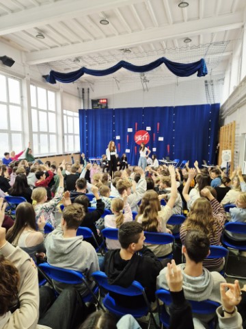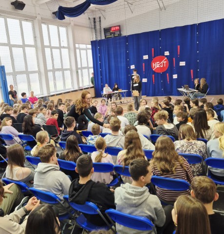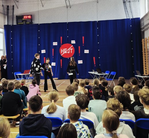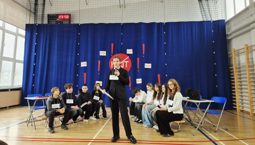 W dniu 14 listopada 2025 w naszej szkole miała miejsce pierwsza debata z elementami teatralnymi, która została przygotowana przez panią Aldonę Kurek. Uczniowie z klasy 8A najpierw zorganizowali krótką inscenizację ilustrującą zjawisko hejtu w różnych kontekstach oraz przeprowadzili krótką interakcję z publicznością. Następnie odbyła się debata, w której uczestnicy na scenie podsumowali całe wydarzenie i przypomnieli o zasadach reagowania na hejt. Przy wyjściu rozdano także ulotki przedstawiające 10 zasad skutecznej walki z hejtem. Mamy nadzieję, że uczniowie naszej szkoły z uwagą śledzili przedstawienie i wezmą sobie do serca słowa, które zostały dzisiaj wypowiedziane na szkolnej scenie.