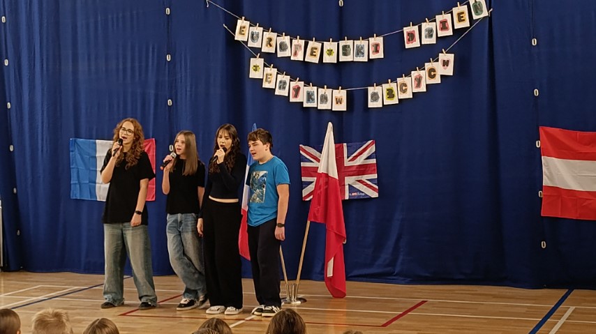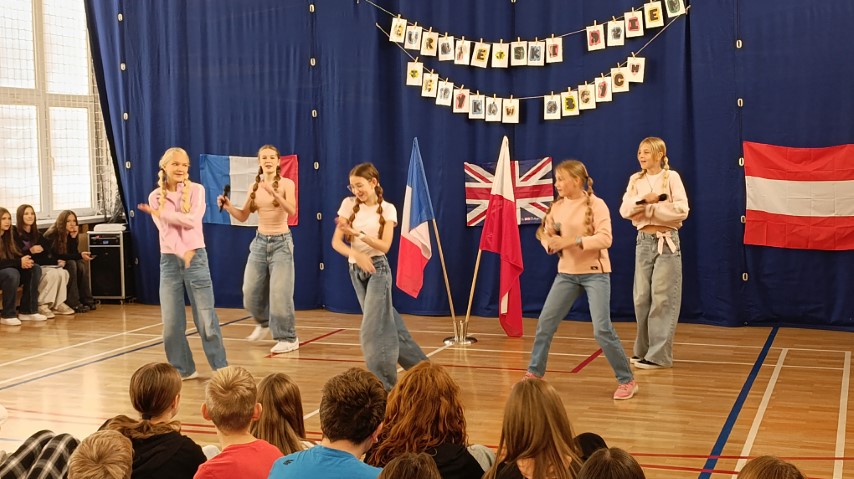 Uczniowie klas IV–VIII zaprezentowali swoje talenty podczas Przeglądu Piosenki Europejskiej. Na szkolnej scenie zabrzmiały znane utwory w różnych językach – od angielskiego i niemieckiego, po hiszpański i włoski. Publiczność mogła podziwiać nie tylko piękne głosy, ale także pomysłowe stroje i choreografie przygotowane przez uczestników.