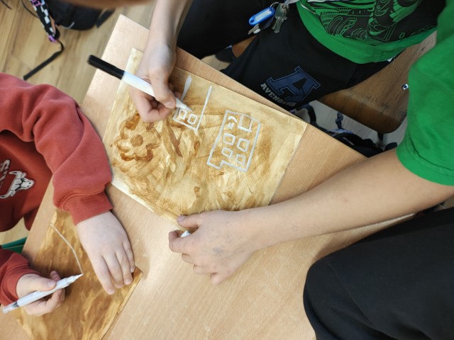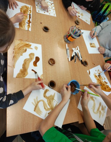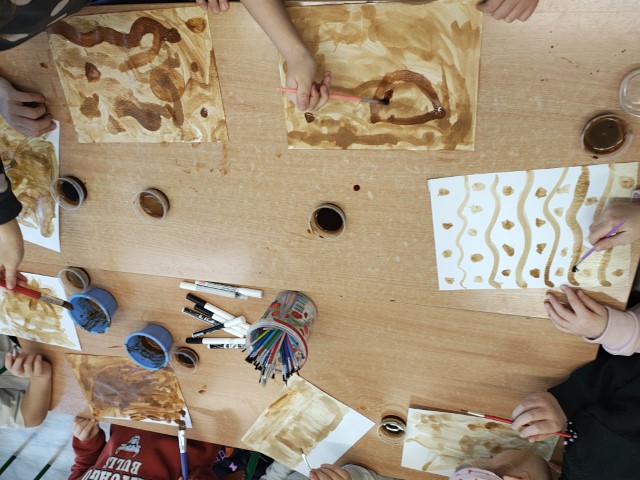 Tym razem zadanie polegało na malowaniu kawą. Piękny aromat przygotowanej „farby” unosił się po całej sali, tworząc wyjątkową, twórczą atmosferę. Uczniowie malowali kawą tło na białym papierze i zauważyli, że w zależności od ilości kawy dodanej do wody intensywność brązowego koloru mogła się zmniejszać lub zwiększać.