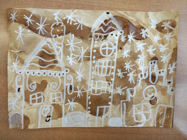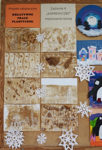 Wykonane prace posłużyły jako tło do zimowych, białych kamieniczek, które dzieci stworzyły przy użyciu białych markerów.