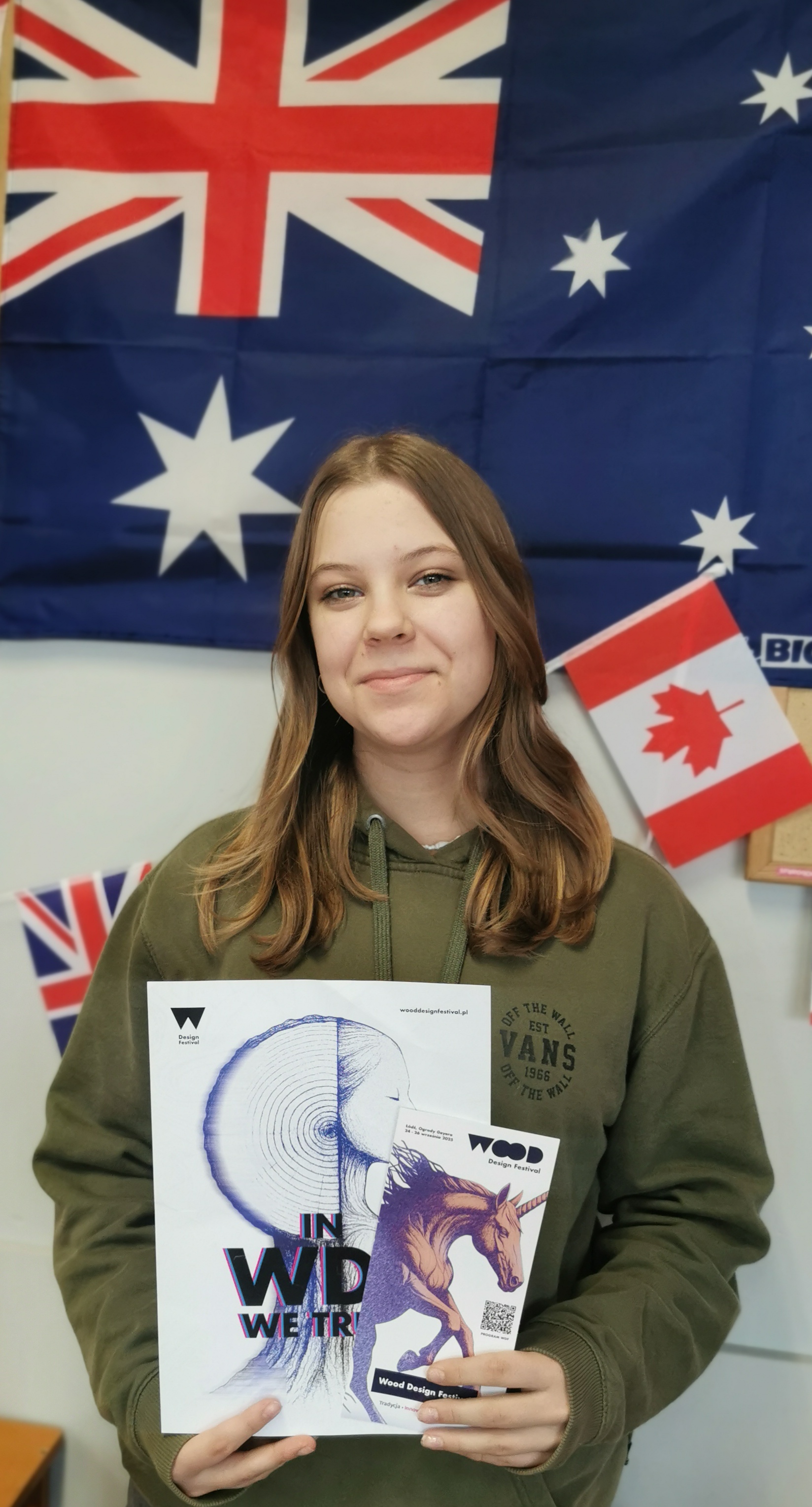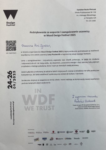W dniach 24 - 26. 09 uczennica klasy 8a Lena Płuciennik brała udział w festiwalu Wood Design. Lena wspierała zespół organizatorów poprzez, między innymi dokumentację wydarzenia w mediach społecznościowych. Lenka została doceniona przez organizatorów festiwalu. Gratulacje Lenko!