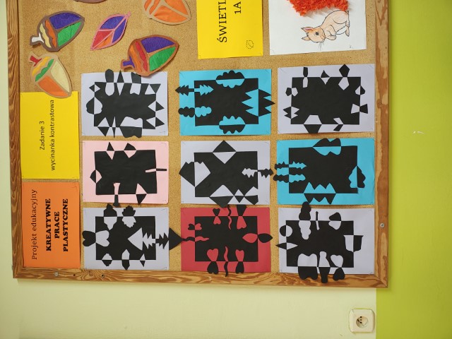 Uczniowie klasy 1a, pod opieką pani Karoliny Ramus, zrealizowali kolejne zadanie w ramach projektu edukacyjnego „Kreatywne Prace Plastyczne”. Tym razem dzieci zmierzyły się z zadaniem plastycznym pt. wycinanka kontrastowa – techniką polegającą na tworzeniu obrazów z wycinanych kształtów w intensywnie kontrastujących kolorach, co znacząco wzmacnia efekt wizualny pracy. Wycięte elementy uczniowie naklejali po obu stronach linii, tworząc lustrzane odbicia kształtów. Proste, a jednocześnie bardzo efektowne rozwiązanie!