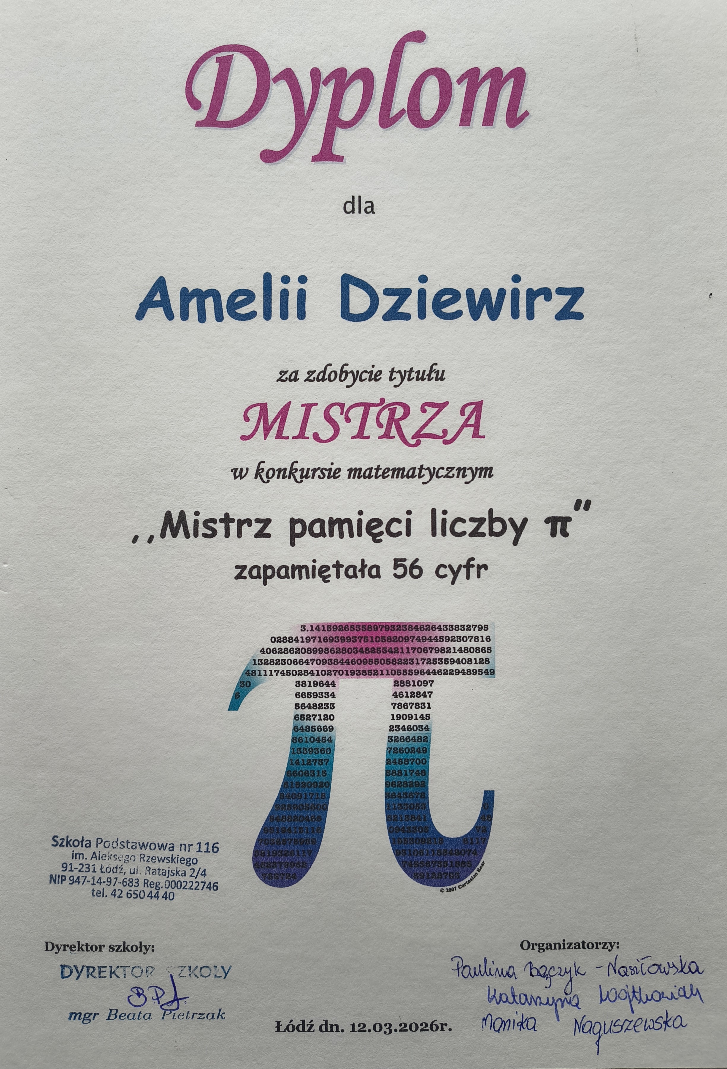 Mistrzem okazała się Amelia Dziewirz z klasy 5a, który zapamiętał 56 cyfr po przecinku w rozwinięciu dziesiętnym liczby pi.