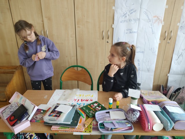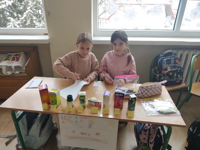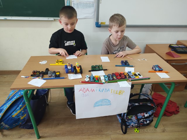 Uczniowie klasy 1b chętnie rozwijają swoje umiejętności poprzez zabawy tematyczne. Tuż przed feriami zimowymi dzieci zamieniły salę lekcyjną w prawdziwe centrum handlowe. Samodzielnie przygotowały szyldy sklepów, cenniki oraz „towary”, a następnie wcielały się w role sprzedawców i klientów.