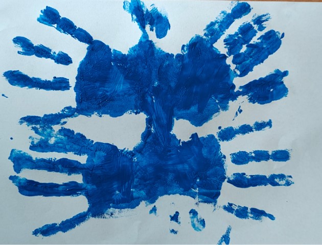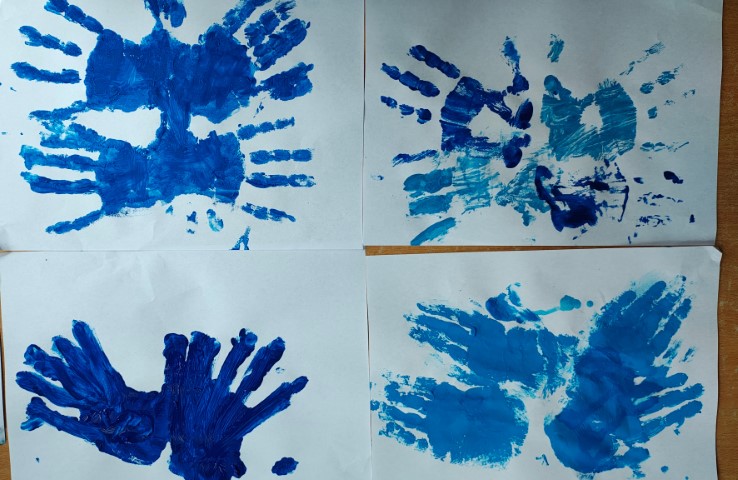 W drugiej części zajęć uczniowie wykonali pracę plastyczną – niebieskie motyle. Do ich stworzenia użyli farb i własnych dłoni.