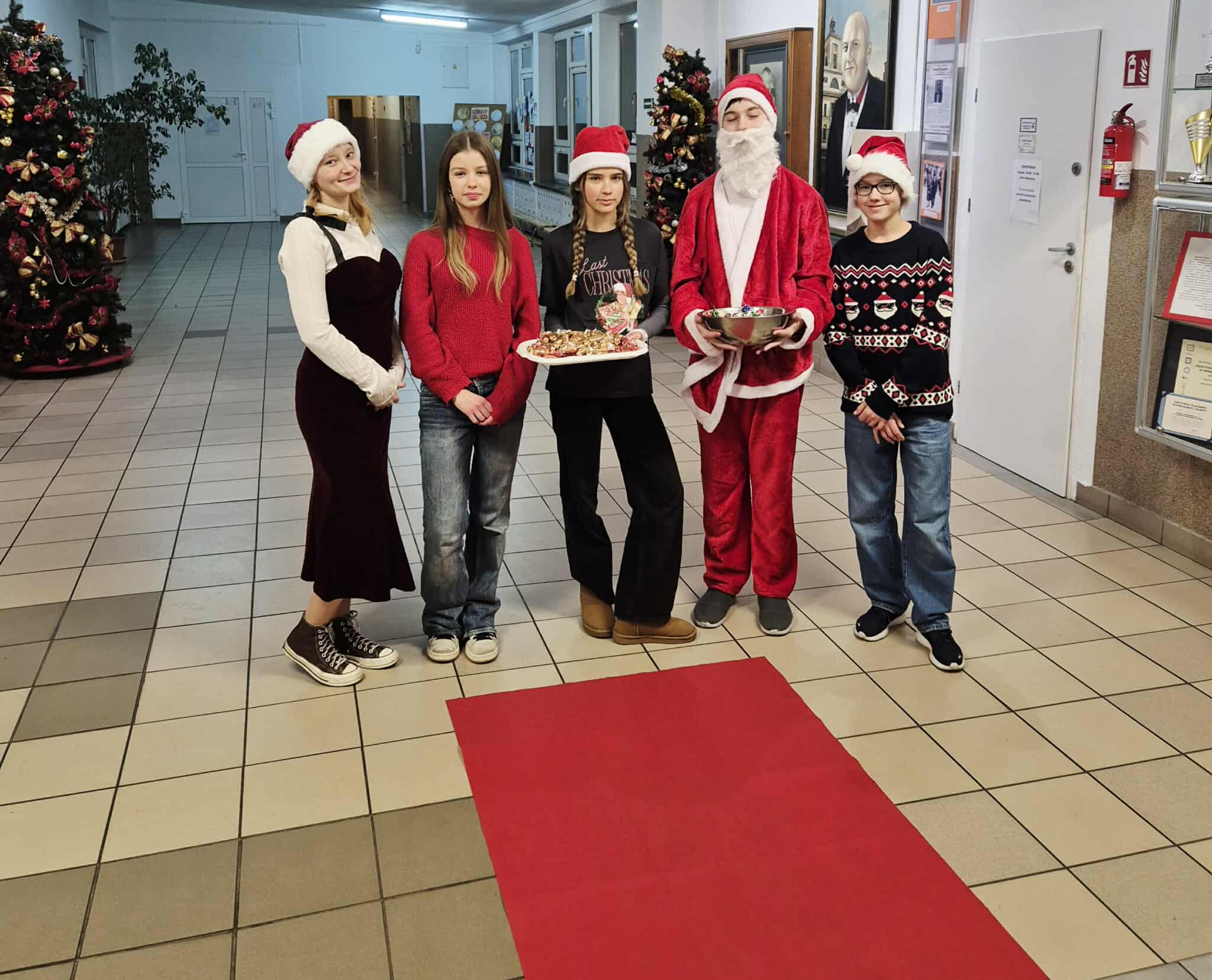 Jak co roku, Samorząd Uczniowski w Mikołajki od rana stał przy głównym wejściu do szkoły, witając wszystkich słodką niespodzianką. Dzieci miały szansę, po raz kolejny przejść po czerwonym dywanie i poczuć się specjalnie wyróżnione w tym dniu. Kolorowy baner, zrobiony specjalnie na tą okazję oraz rytmiczna świąteczna muzyka, również umilały wszystkim dzień. Uczniowie z Koła Wolontariatu również witali wchodzących uczniów i rozdawali pozytywne sentencje!