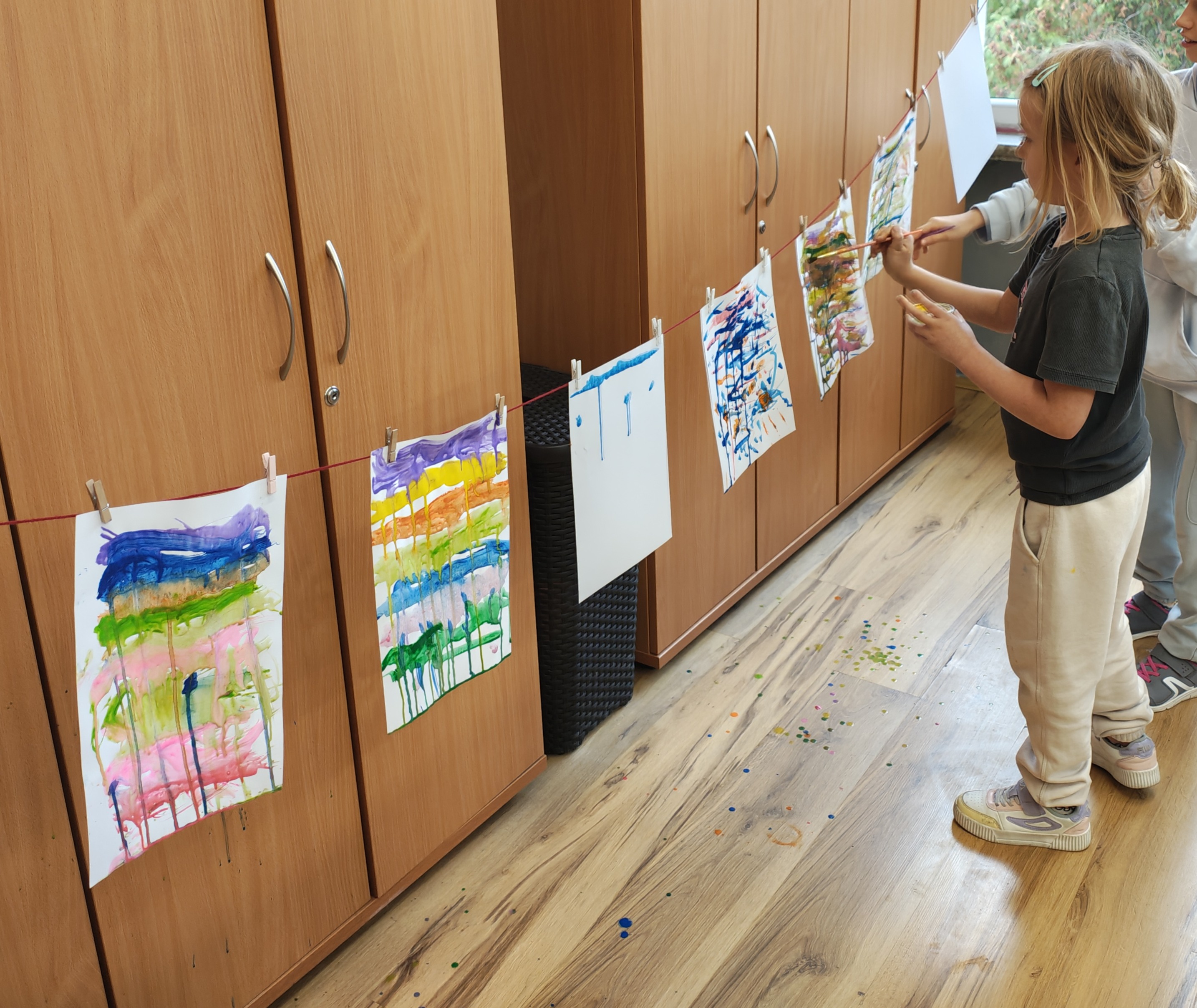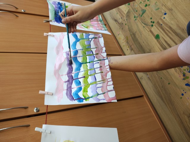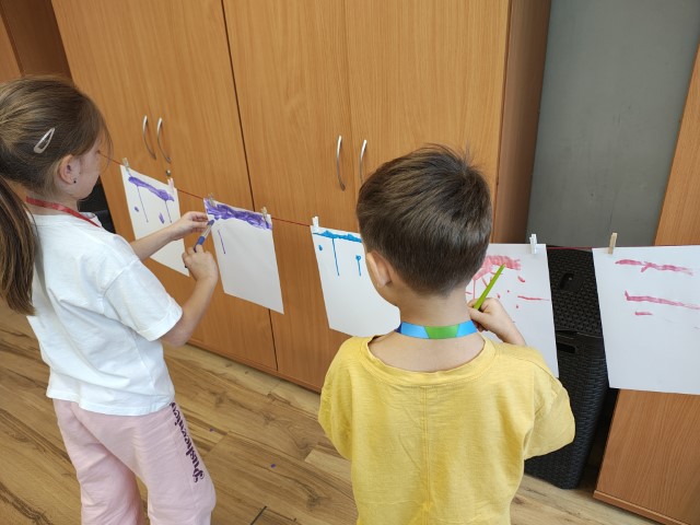 To niezwykła zabawa plastyczna, która łączy elementy nauki i sztuki. Rozmawialiśmy o zjawisku grawitacji, a następnie przystąpiliśmy do działania! Uczniowie zawiesili kartki papieru na sznurku w klasie i malowali je rozcieńczonymi z wodą farbami w taki sposób, by farba swobodnie spływała w dół.