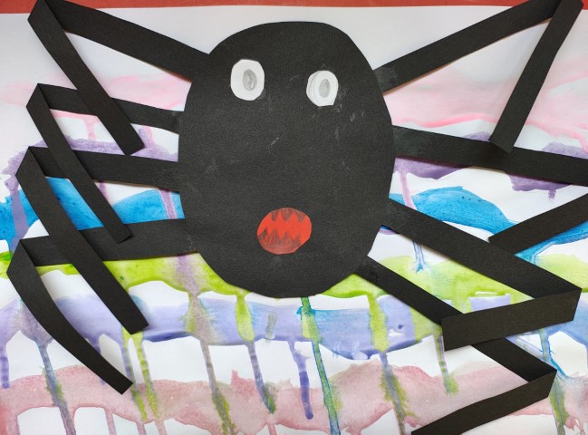 Dzięki sile grawitacji kolory łączyły się i przenikały, tworząc piękne, abstrakcyjne wzory. W ten sposób powstał nasz własny „papier artystyczny”, który posłużył jako tło do kolejnego etapu pracy – wykonania pająków z papieru.