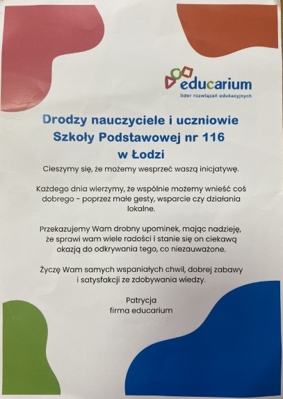 Podziękowanie dla firm Educarium i Moje Bambino.