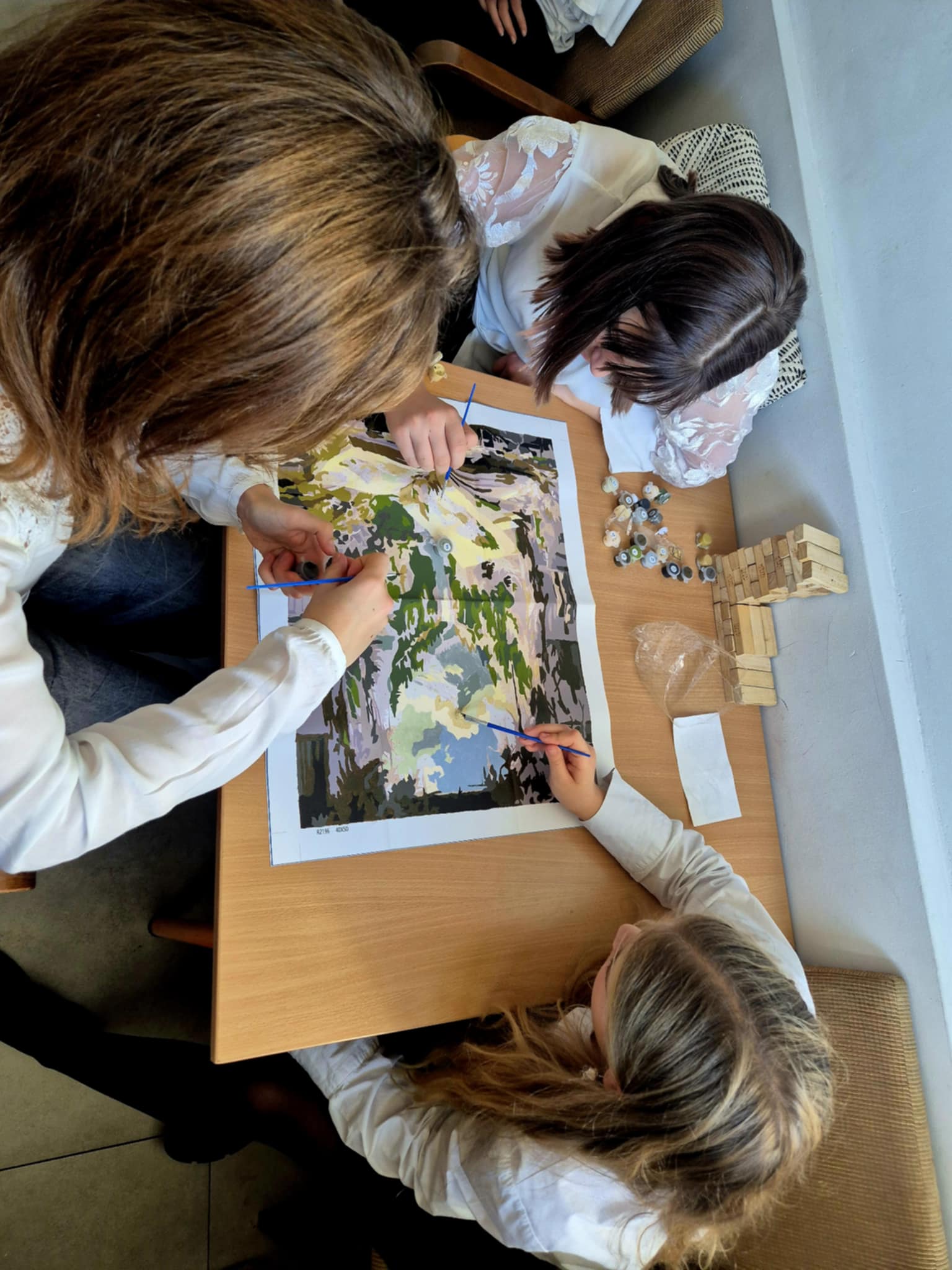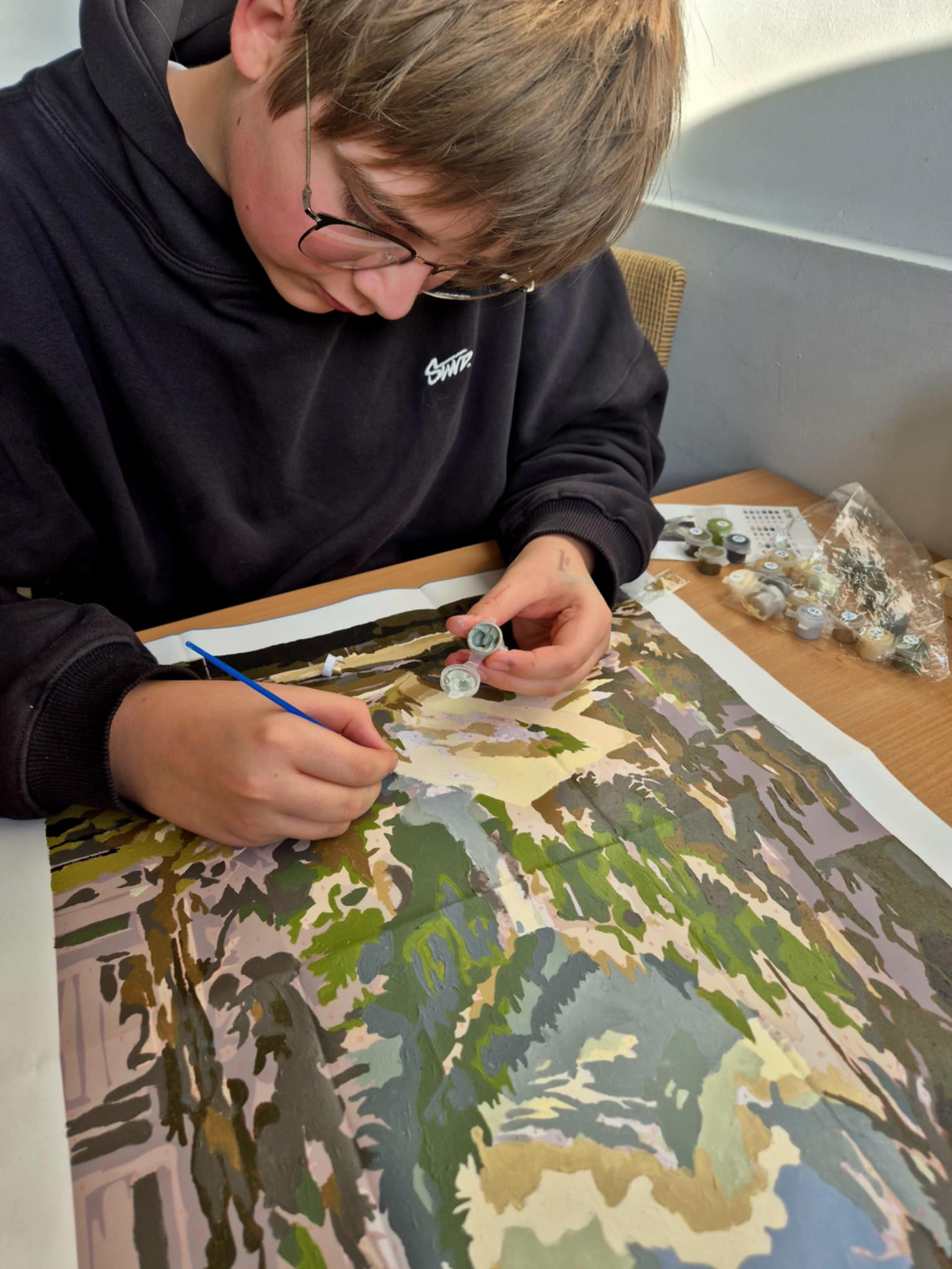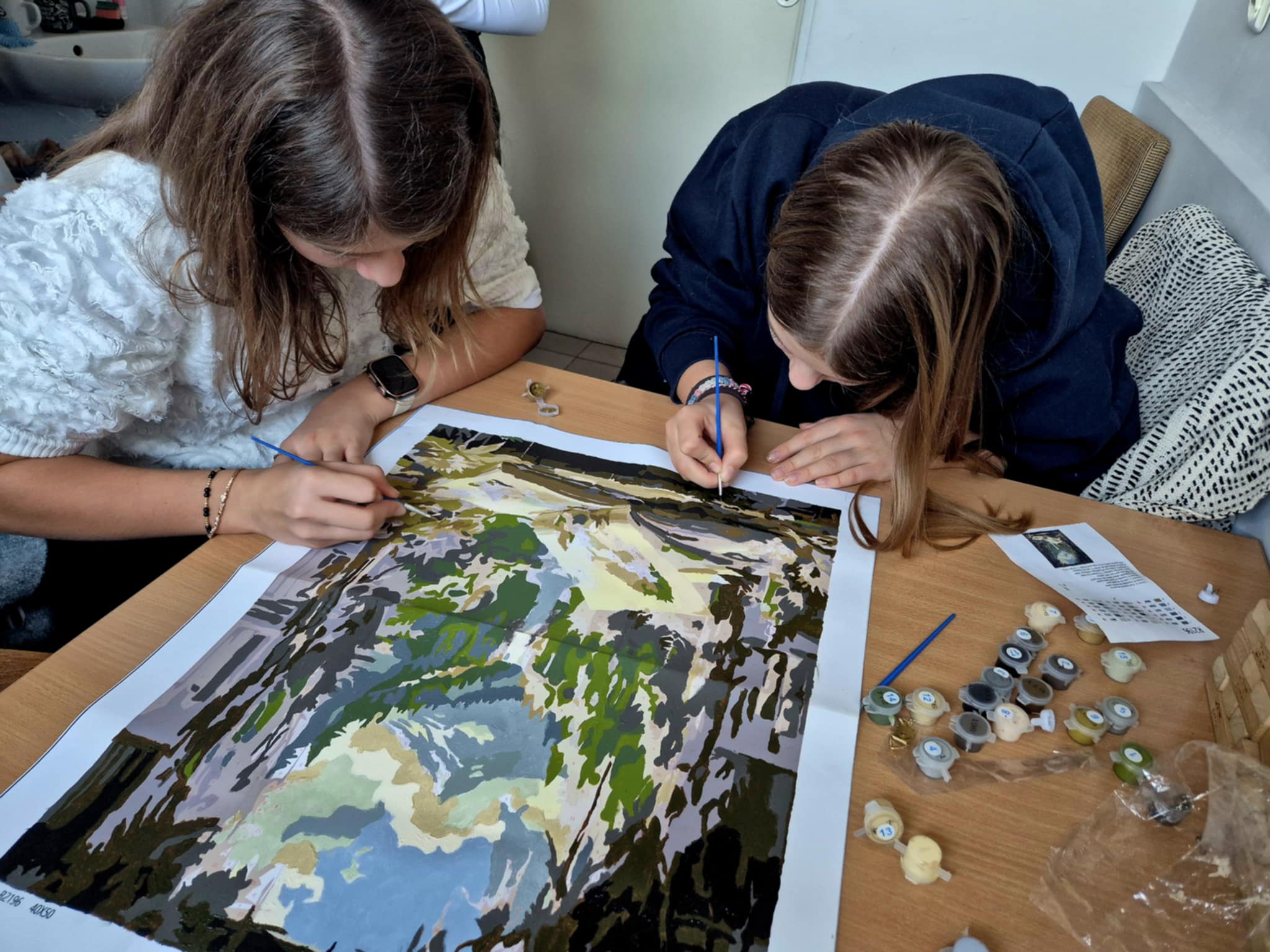 Od września uczniowie klas 4-8 mieli okazję, podczas przerw, na chwilę odpocząć i zrelaksować się w gabinecie pani psycholog przy płótnie. Każde dziecko mogło wybrać „cyferkę” i na moment zapomnieć o wokół panującym hałasie oraz szkolnych zmartwieniach. Malowanie, a w szczególności technika malowania po numerów, jest uznawane za skuteczny sposób na uwolnienie się od stresu i zrelaksowanie w obliczu codziennych trudności. Wspólnie uczniowie stworzyli piękny obraz, który będzie zdobił naszą szkołę.