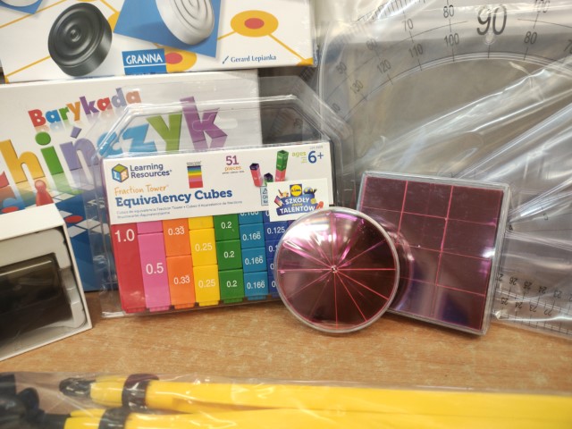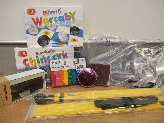 Sprzęt sportowy: zestaw paletek i piłeczek do tenisa stołowego, zestaw do badmintona, piłki do koszykówki, siatkówki i piłki nożnej wraz z pompką. Pomoce dydaktyczne do matematyki: duży zestaw magnetycznych przyborów tablicowych (ekierki, linijki, kątomierz, cyrkiel) oraz zestaw bloków i kół do nauki ułamków. Poza tym punkty wymieniliśmy na dużą, wyposażoną apteczkę i gry planszowe.