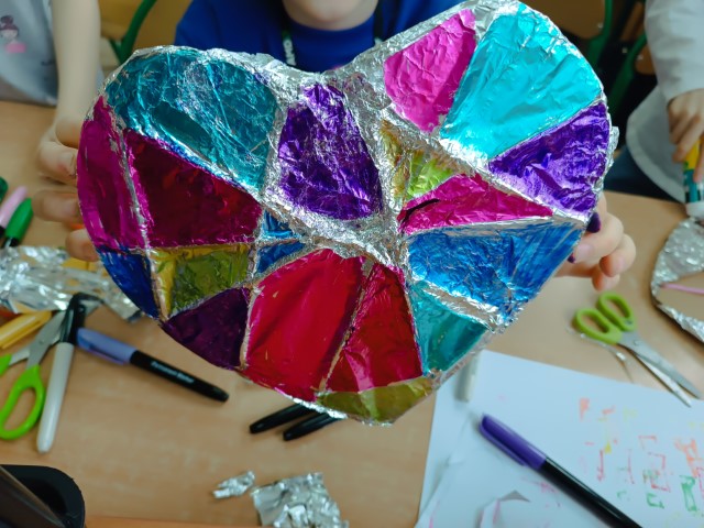 Walentynki w świetlicy szkolnej były świetną okazją do wykazania się kreatywnością w stworzeniu kartek walentynkowych oraz serduszek. Świetliczaki z grupy 1b1c wykonały witraże w kształcie serca z wykorzystaniem folii aluminiowej oraz sznurka. Tak niewiele potrzeba było, aby stworzyć piękne prace.