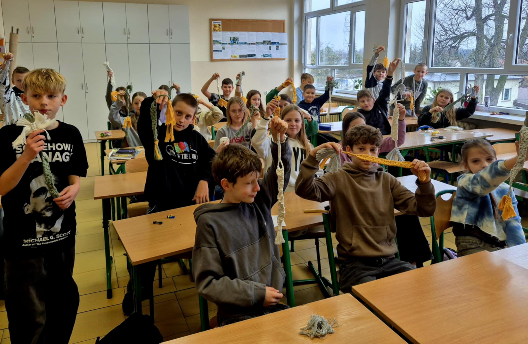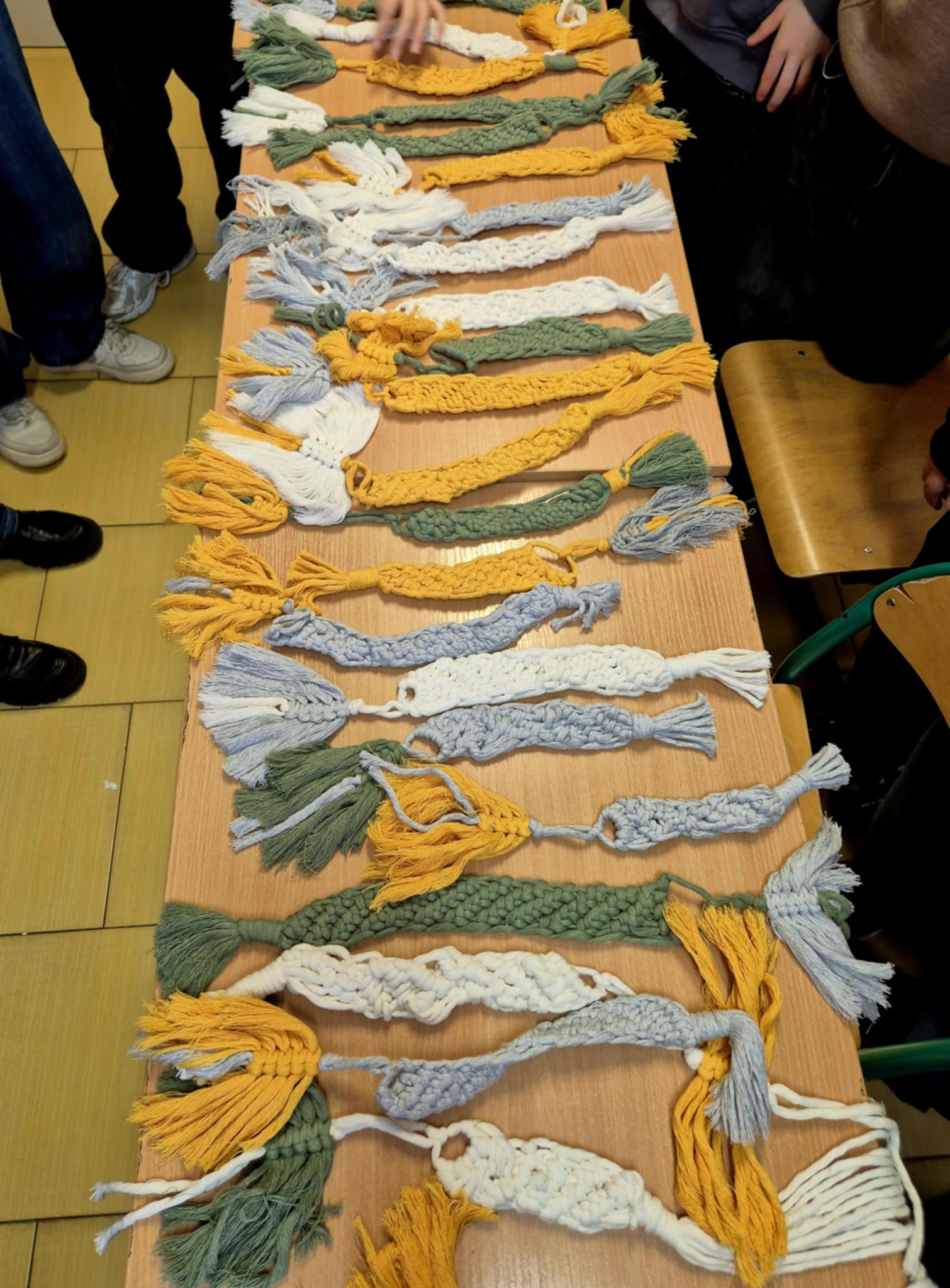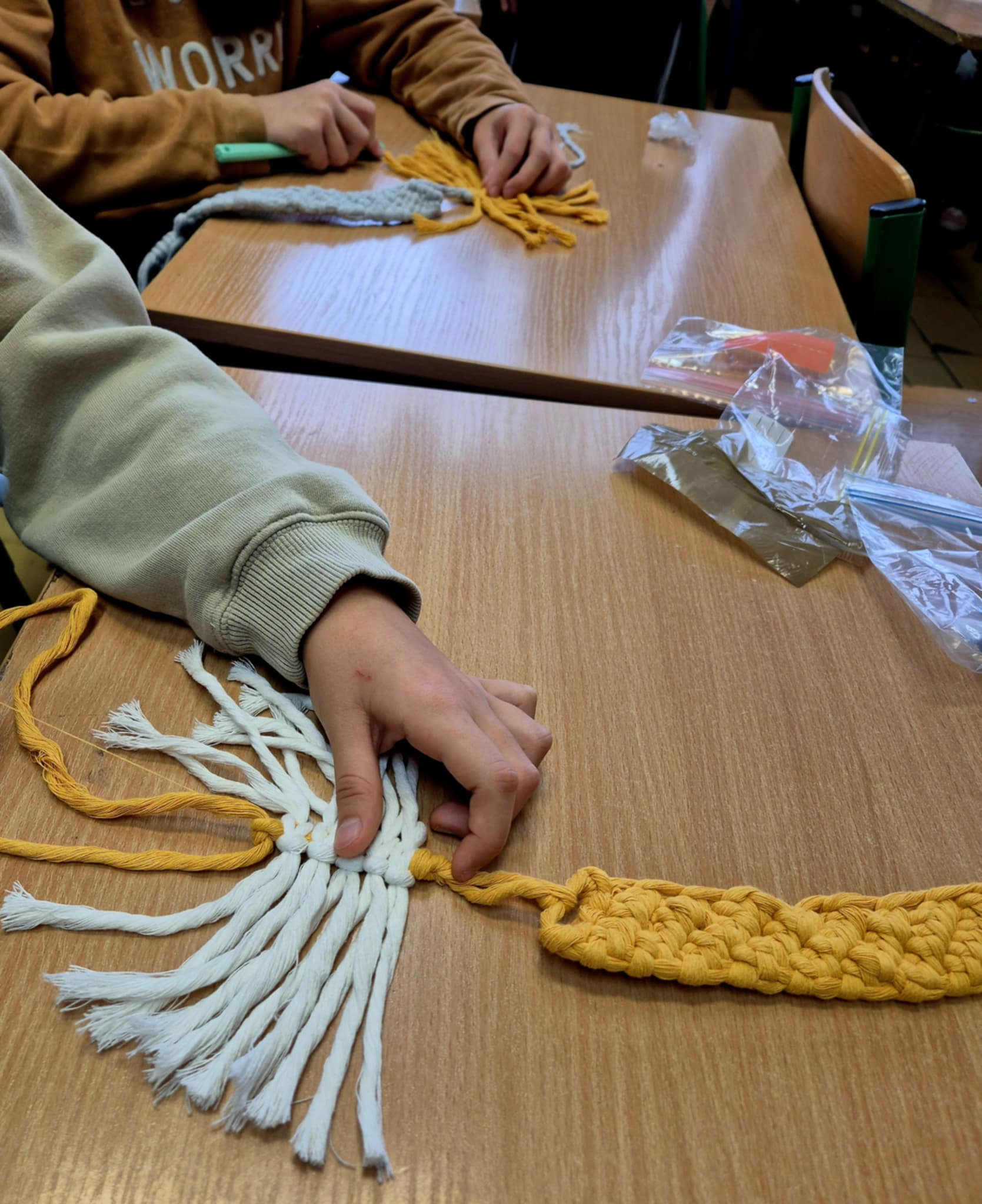 Dnia 17.11.2025 r. Pani Edyta Jończyka, mama Maksa z klasy 5a, uczyła dzieci sztuki robienia makramy - techniki tworzenia ozdób i tkanin poprzez wiązanie sznurków specjalnymi, powtarzalnymi węzłami, bez użycia igieł, szydełek czy drutów. Dwugodzinne warsztaty okazały się niesamowitym sukcesem, nie tylko pod względem pięknych zakładek, które powstały, lecz również integracji i wspólnego działania. Dzieci, które szybciej wykonały zadanie, chodziły po klasie i pomagały innym uczestnikom potrzebującym wsparcia. Podczas warsztatów wychowawczyni Dorota Bartczak, pani pedagog Aldona Kurek oraz psycholog Kinga Blachowska wspierały dzielnie mamę Maksa.