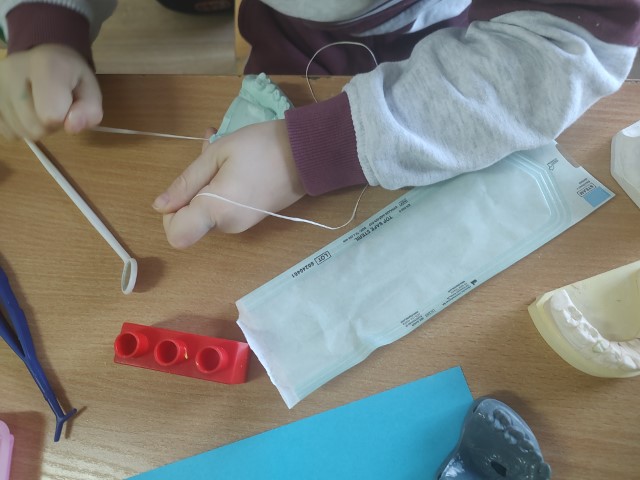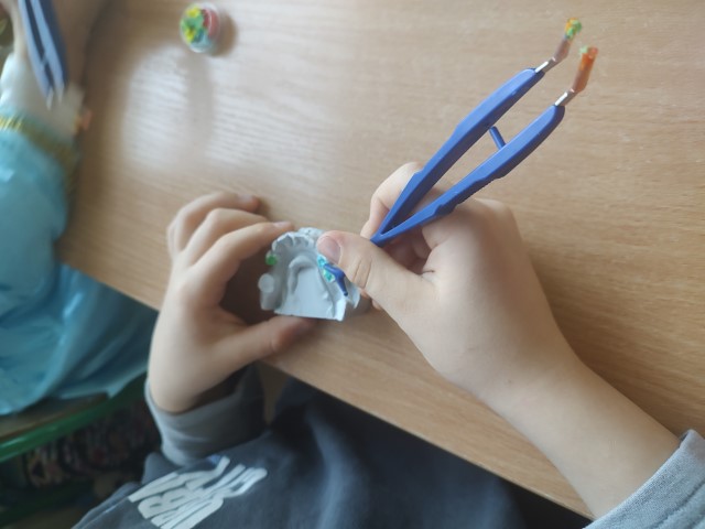 Podczas zajęć uczniowie poznali budowę zębów, wypełnili własne karty stomatologiczne, a następnie – niczym prawdziwi dentyści – „zaplombowali” znalezione ubytki. Przypomnieli sobie również zasady higieny jamy ustnej oraz wykonali ciekawy eksperyment, dzięki któremu mogli zobaczyć, jak pasta do zębów chroni szkliwo.
