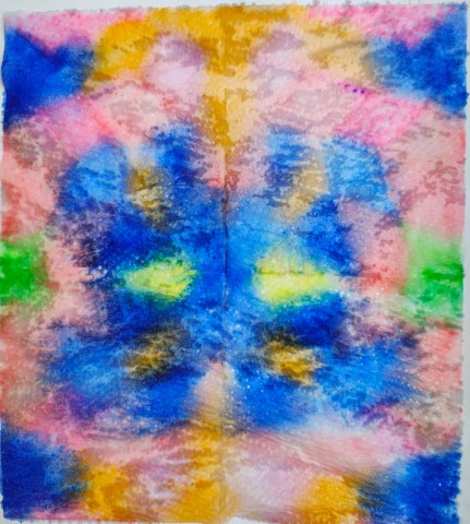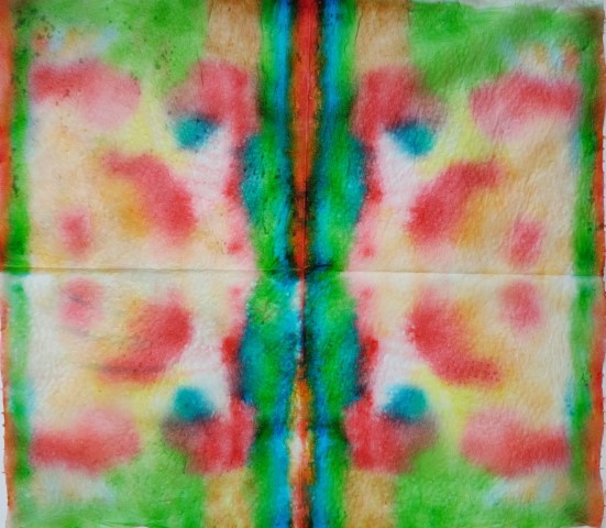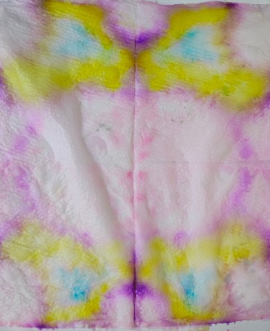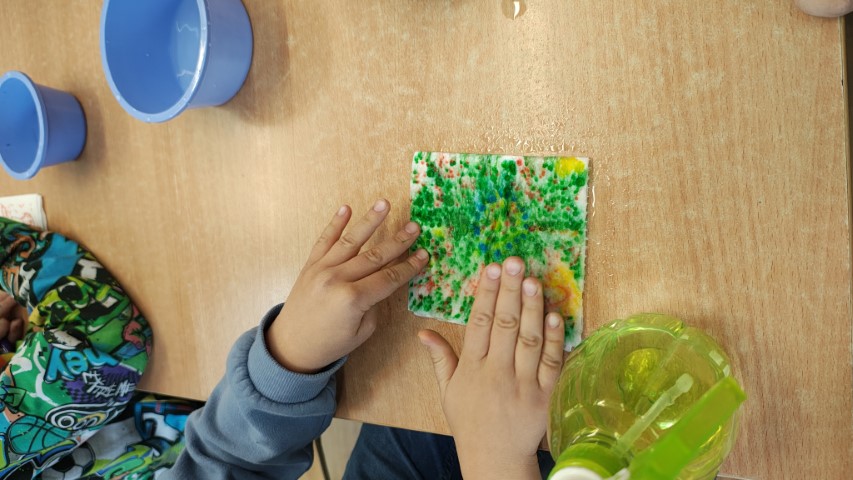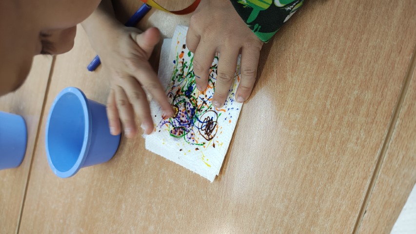 Do wykonania zadania wykorzystaliśmy ręczniki papierowe, które uczniowie składali na cztery części. Następnie ozdabiali je różnokolorowymi kropkami – większymi i mniejszymi, układanymi w rozmaite wzory. Kolejnym etapem było spryskanie papieru wodą z butelek ze spryskiwaczem. Dzięki temu barwy z mazaków rozmywały się, tworząc niezwykłe, tęczowe kompozycje.