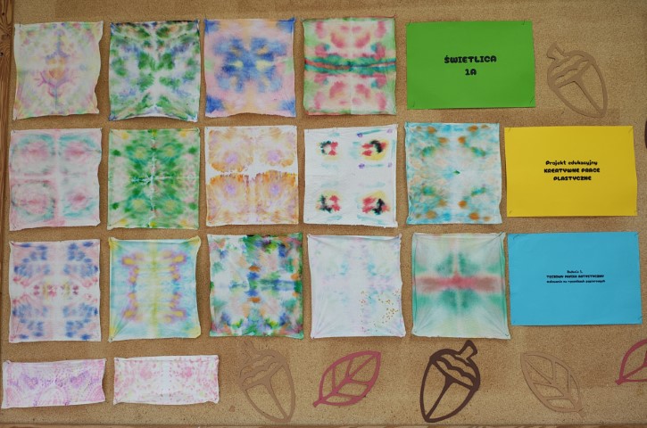 Po rozłożeniu papieru mogliśmy podziwiać efekt naszej pracy – barwne, niepowtarzalne dzieła, które stały się ozdobą szkolnej gazetki na pierwszym piętrze.